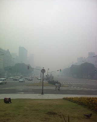 Así se veía la Av. 9 de Julio este sábado al mediodía. Quienes añoran el perfil europeo de la ciudad, ni siquiera pueden decir que se parece al Londres de antaño. Más bien pareciera que hubiera un gran horno encendido, pues todo, absolutamente todo huele a humo. Es como si fuera "el día después" de un país que dejó su tradicional costumbre de tener aire puro para respirar...